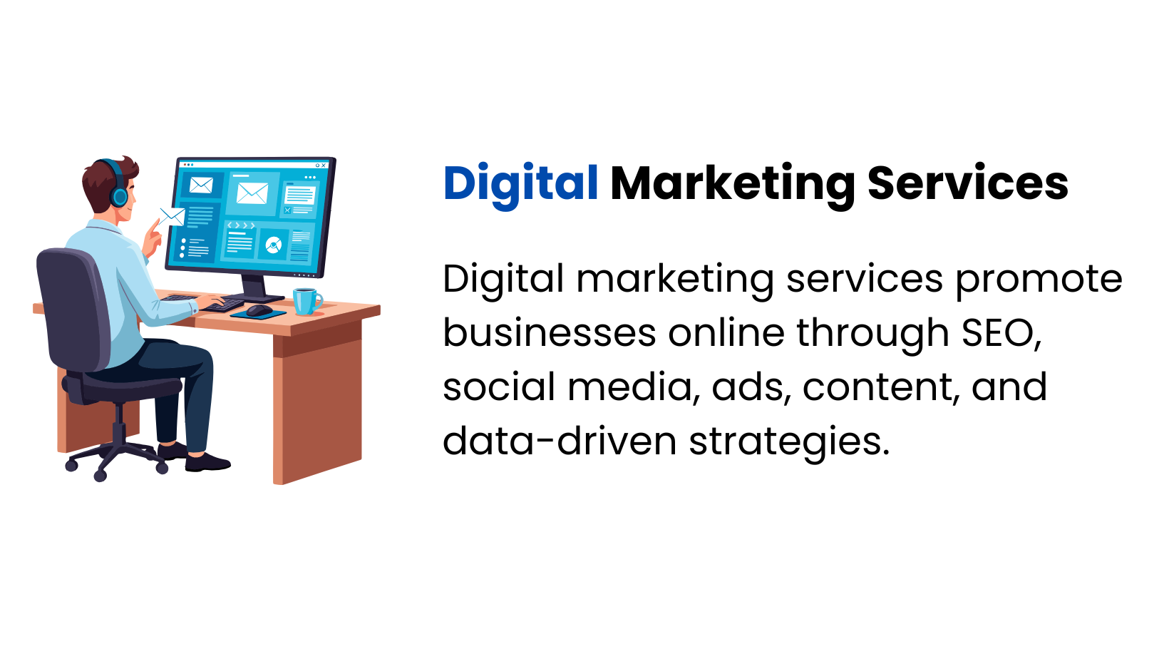 Our core services include website design & development, where we create responsive, user-friendly, and high-converting websites tailored to your business goals. We offer complete digital marketing services, including SEO, social media marketing, PPC, and content marketing, to boost your online visibility and generate quality leads.